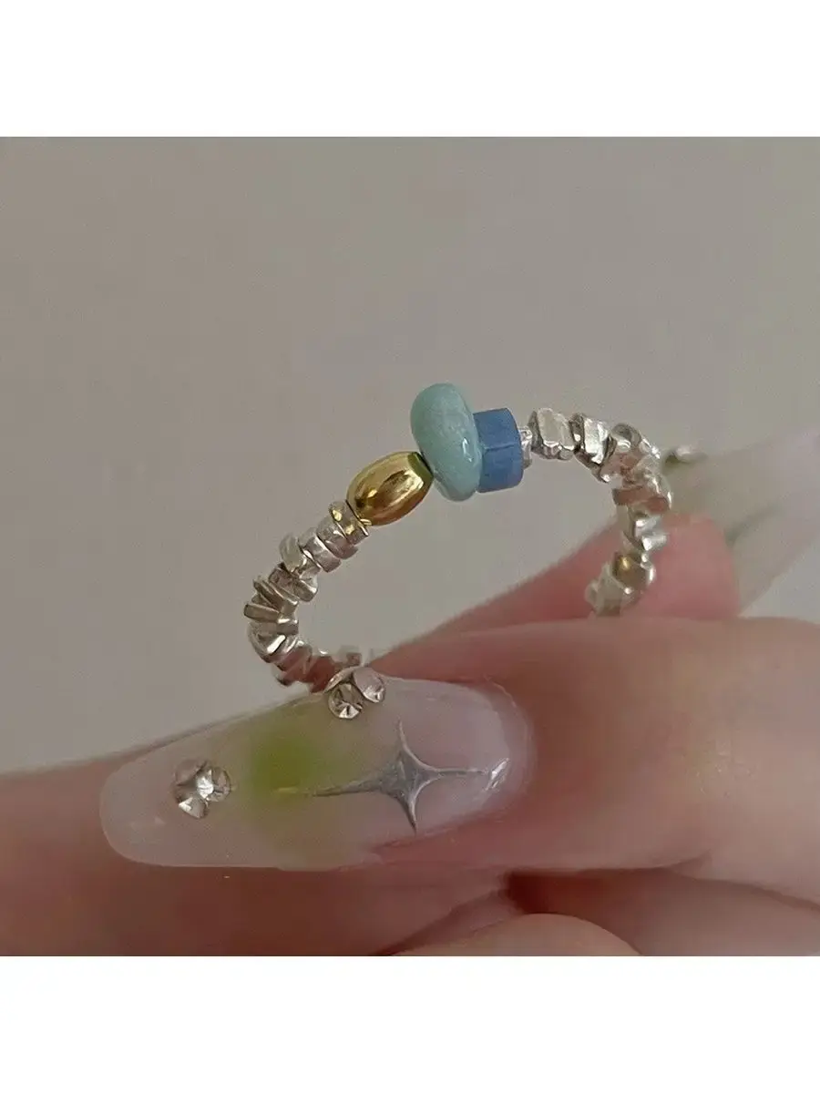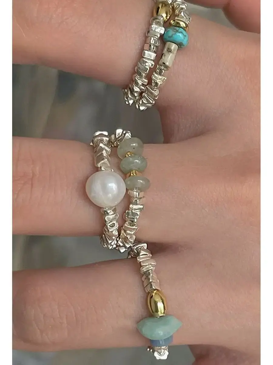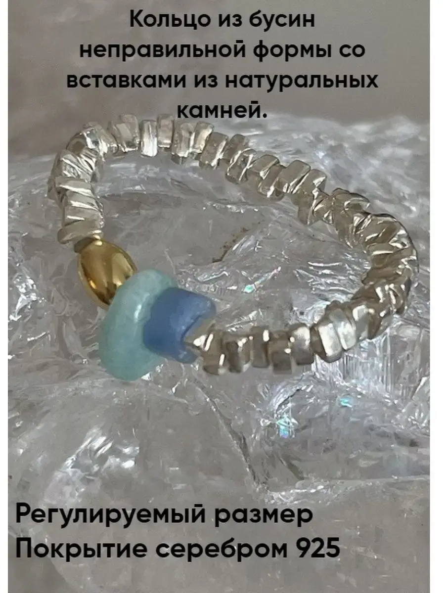 Кольцо из бусин неправильной формы с вставками из натуральных камней идеально подходит как для ежедневного ношения, так и для вечеринки. Бусины собраны на эластичную нить, что позволяет носить кольцо на любом пальце, не зависимо от размера.