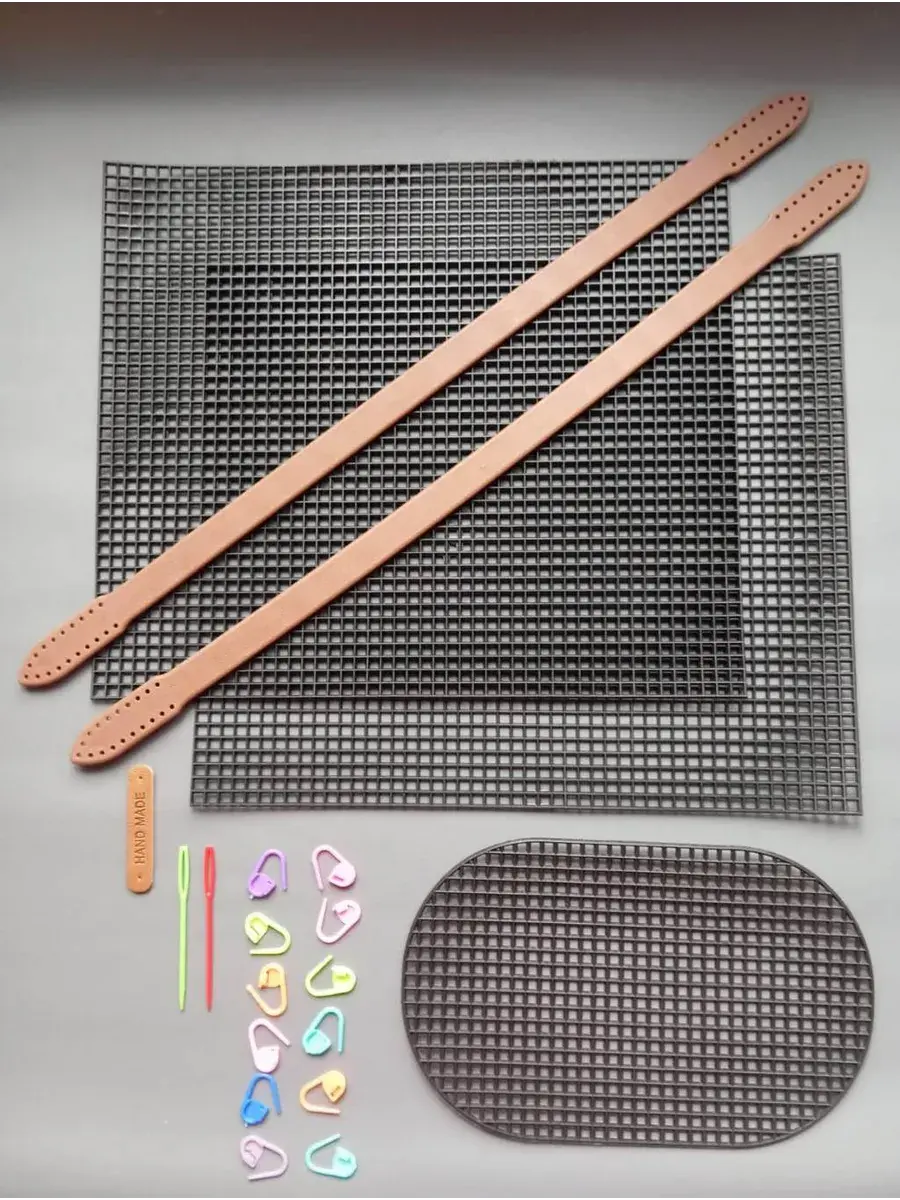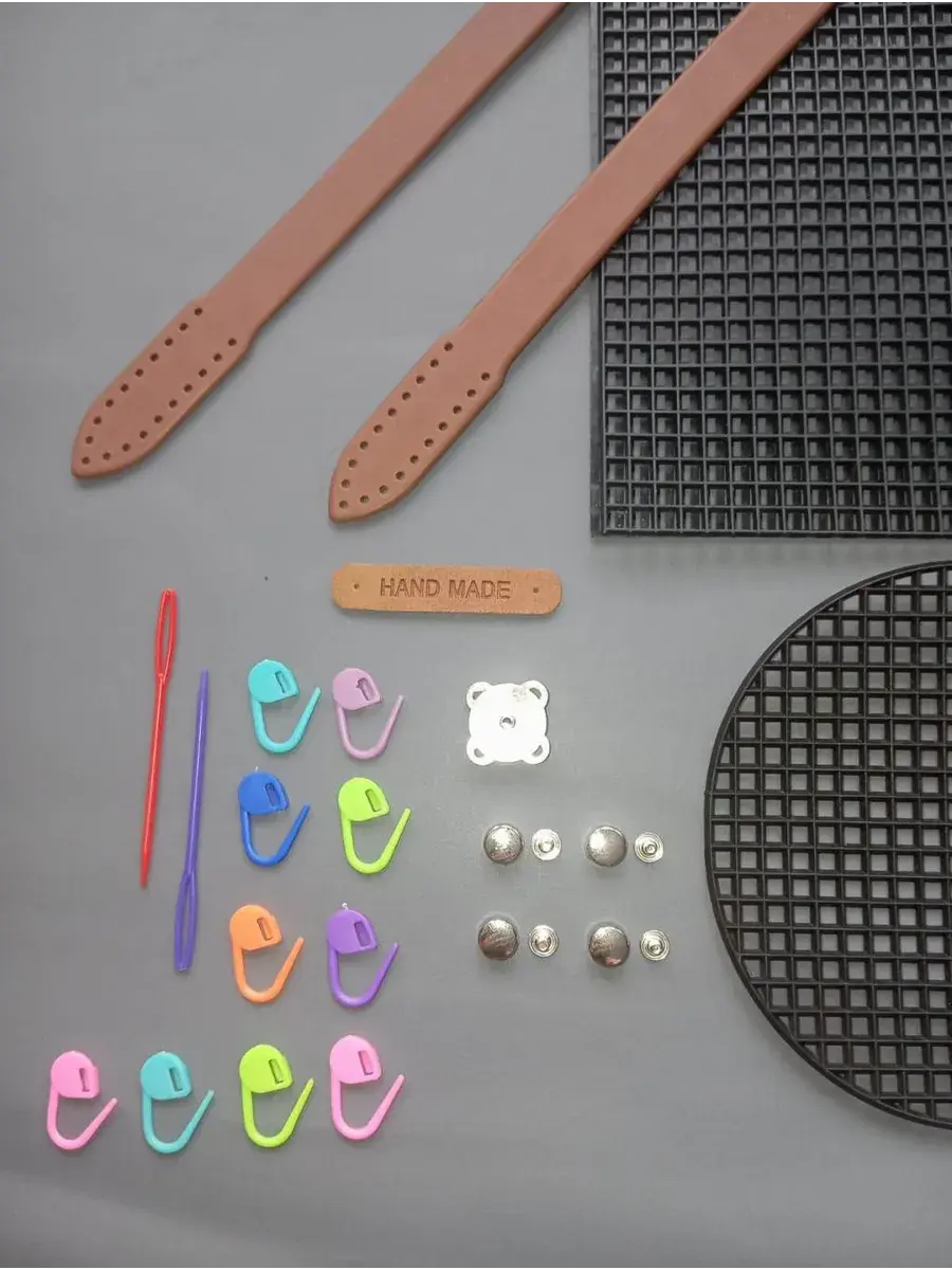 Ручки для сумки, нашивка HAND MADE, ножки для сумки, магнитная кнопка 18 мм, маркеры и две иглы входят в комплект.