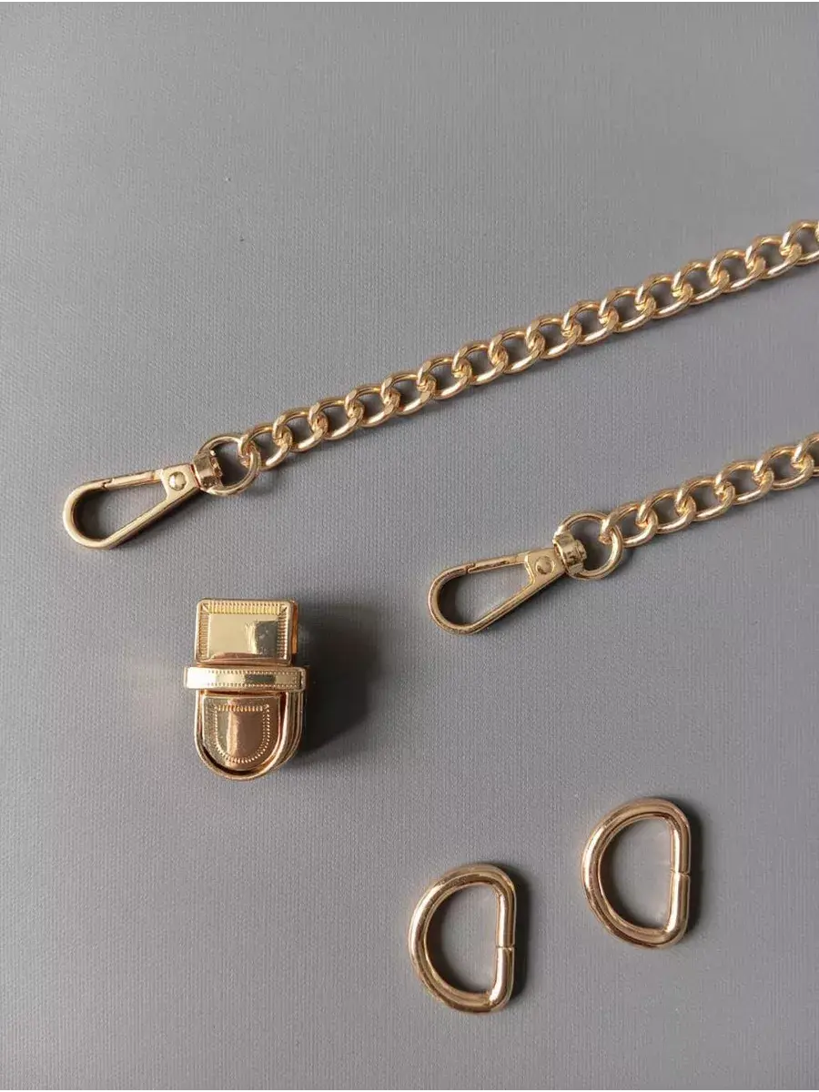 Набор фурнитуры для сумок. В набор входит ремень цепочка длиной 120 см (ширина звена цепи 8 мм), портфельный замок для сумки 32 mm х 22 mm, два полукольца (внутренний размер 20х12,5 mm). Фурнитура изготовлена из металла, с гальваническим покрытием. С набором фурнитуры от команды DK STYLE Вы можете создать свою уникальную сумочку. Набор фурнитуры идеально подойдет для сумочек маленького и среднего размеров.