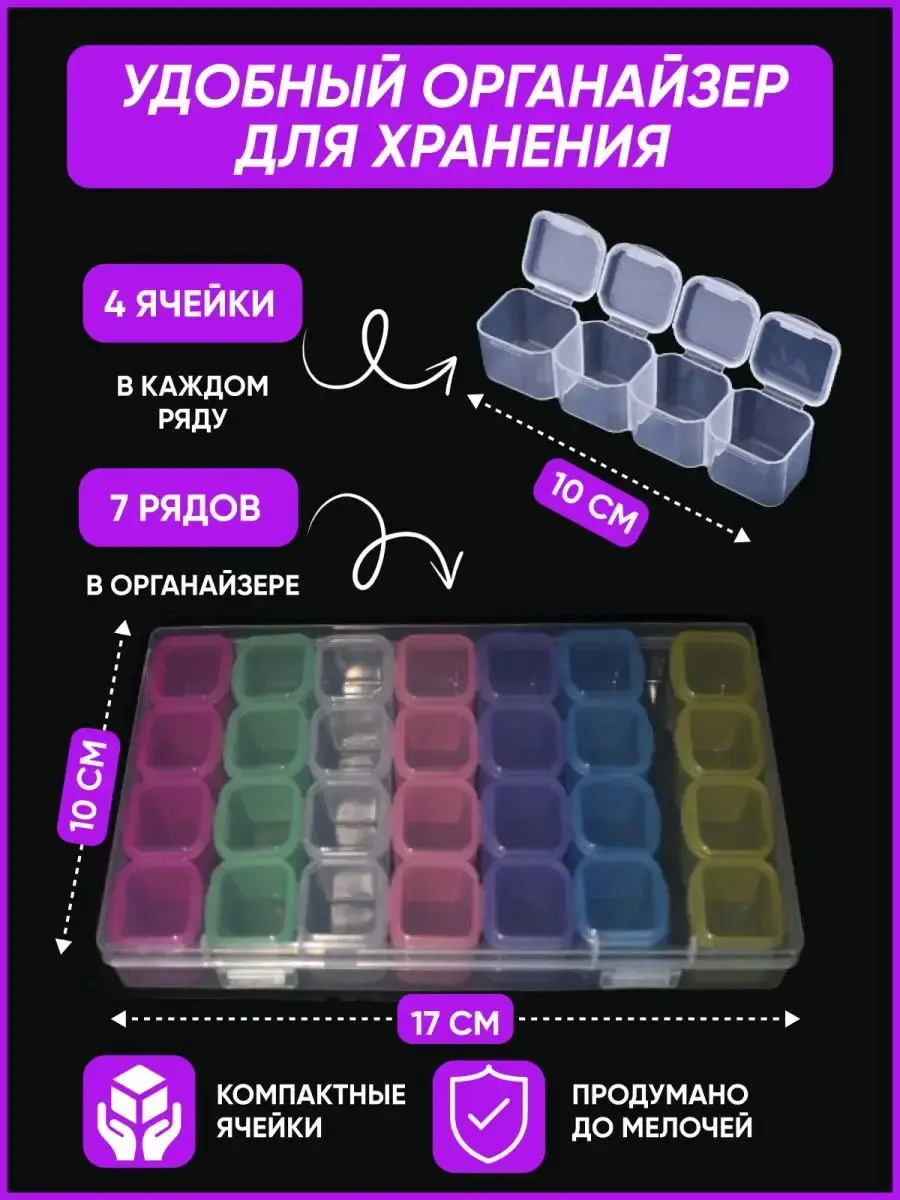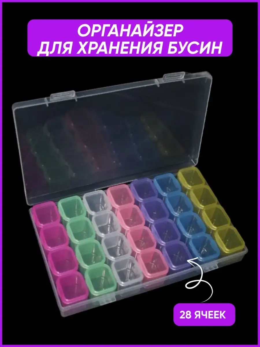 Пластиковый органайзер со съемными ячейками для хранения бисера, бусин, украшений, страз. Незаменимый аксессуар для швеи и рукодельницы. Изготовлен из пищевого пластика, можно использовать как таблетницу для хранения медикаментов. 7 блоков по 4 ячейки (высота ячейки 2 см, глубина ячейки 2 см, ширина ячейки 2,2 см.), каждая закрывается индивидуальной крышкой, что позволяет хранить мелочи, избегая их перемешивания внутри органайзера.