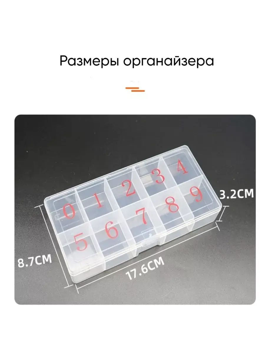Пластиковый органайзер для хранения мелочей, бисера, бусин, украшений, страз. Незаменимый аксессуар не только для швеи и рукодельницы, но и для рыбака. Изготовлен из пищевого пластика, можно использовать как таблетницу для хранения медикаментов. 10 вместительных ячеек 4 см х 2,2см, прочный пластик, надежная застежка!