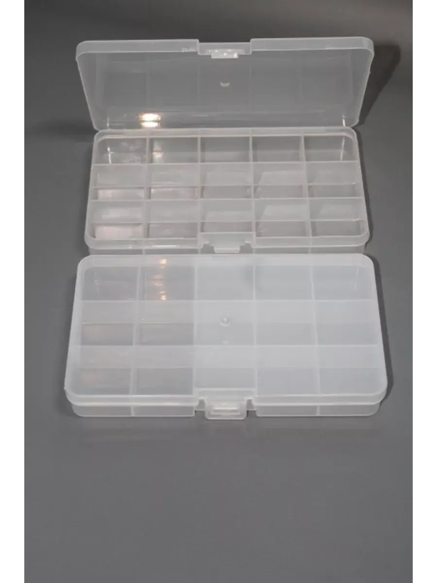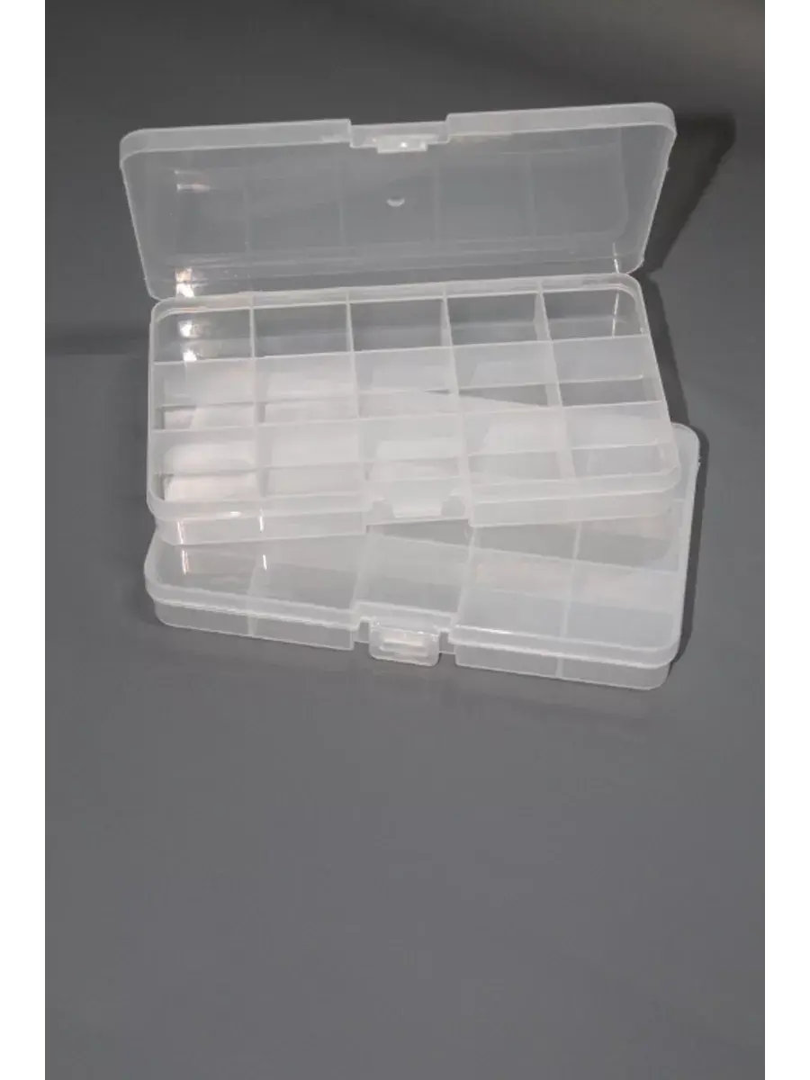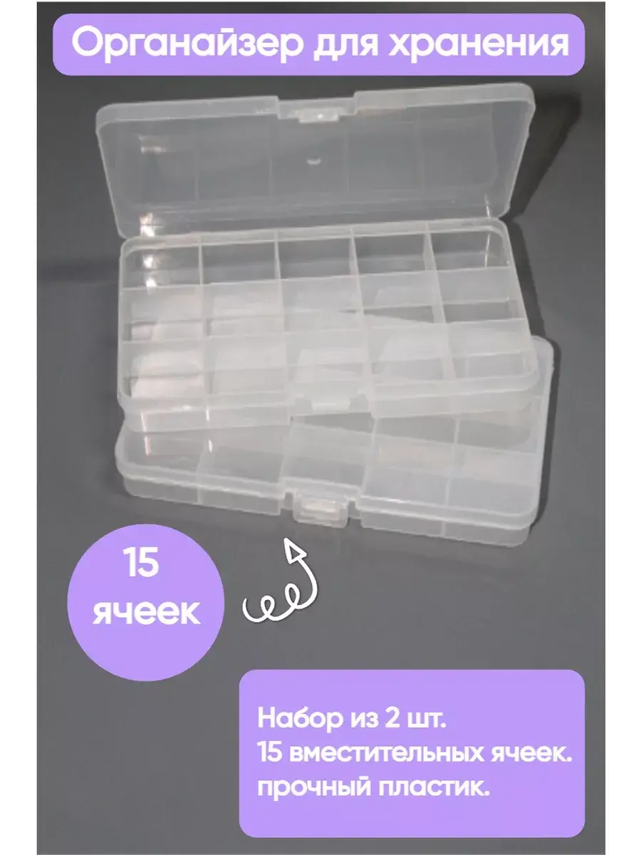 Два пластиковых органайзера 17,7*10,2*2,3 см для хранения мелочей, бисера, бусин, украшений, страз и прочих мелочей. 15 вместительных ячеек 3*3*2,3 см. Незаменимый аксессуар для швеи и рукодельницы. Изготовлен из пищевого пластика, можно использовать как таблетницу для хранения медикаментов.