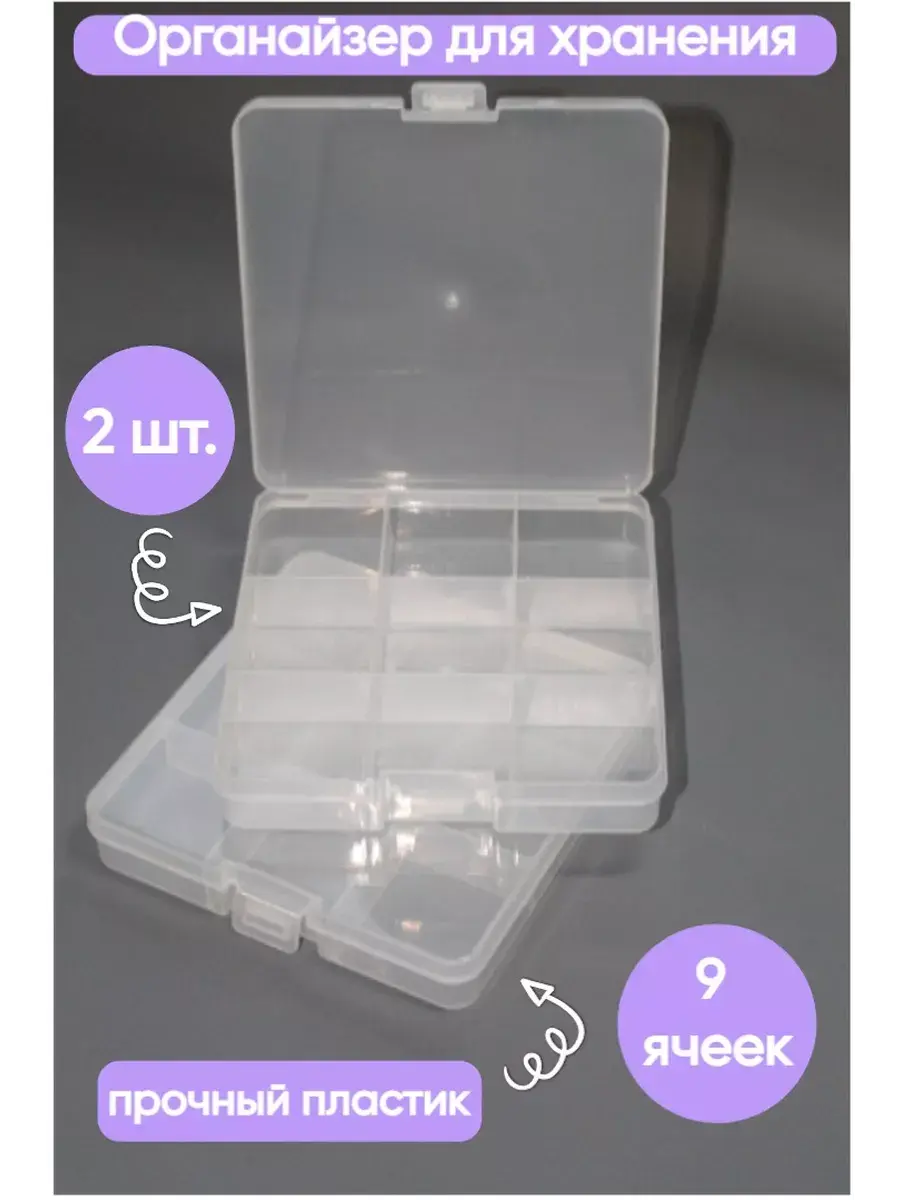 Два пластиковых органайзера 13,5*13,7*2,3 см для хранения мелочей, бисера, бусин, украшений, страз. 9 вместительных ячеек 4*4*2,3 см. Незаменимый аксессуар для швеи и рукодельницы. Изготовлен из пищевого пластика, можно использовать как таблетницу для хранения медикаментов.